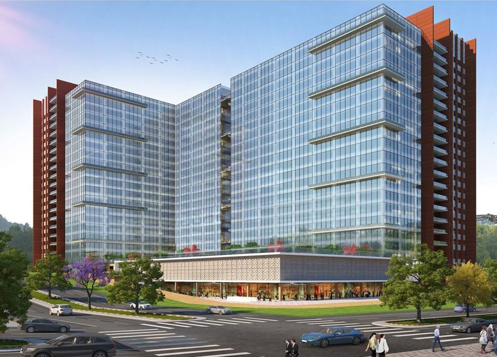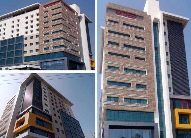 Facade project featuring glazing with cladding and stone cladding, delivering a crisp contemporary envelope and durable performance for this development in Pune.