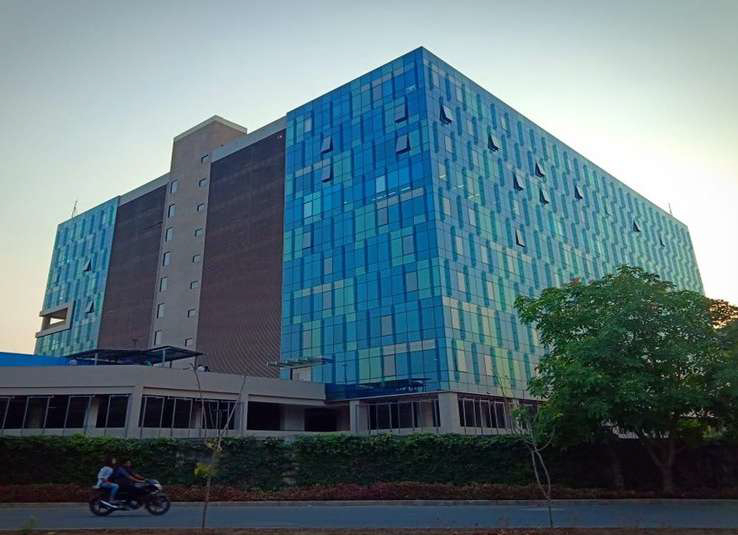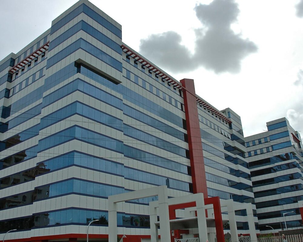 Facade project featuring glazing with cladding and aluminum louvers, delivering a crisp contemporary envelope and durable performance for this development in Hyderabad.